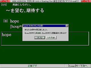 ※エスケープ(Esc)キーで学習を中断することができます. 判定問題の入力が終わると判定され正解か間違いかが表示され,正解の音声が再生されます. 正解したときはエンター(Enter)キーで次の問題に進みます.最後の問題の場合は結果表示に進みます.ただし,『おさらい』として同じ問題の入力に進む場合があります. 間違えたときは正解と見比べてどこが間違ったか見てみましょう.見てみたらエンター(Enter)キーでこの問題に再挑戦します.単語の学習では問題に正解するまで次の問題に進むことは出来ません.ただし,『おさらい』で間違えた場合は先に進みます.