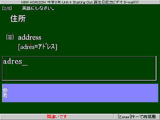 問題を間違えてしまったときは通常,再入力になります.再入力では間違えた単語のうち,間違えた綴り(つづり=文字)だけを入力し直します.その他の点については最初の入力と同じです. おさらい最初の入力で間違えた場合のうち,半分以上の綴りを間違えた場合は,再入力で正解した後にもう一度だけ入力します.これがおさらいです.おさらいでは最初の入力と同じように全ての綴りを入力します.ここで正解できなくても次に進みます.