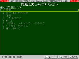 学習に入る前に出題する問題を選びます.問題は↑↓キーで移動してスペースキーで選びます(選ばれた問題は色が白くなります).学習したい問題を全て選んだらリターンキーを押すと学習画面に進みます. 学習画面: 挑戦してみよう